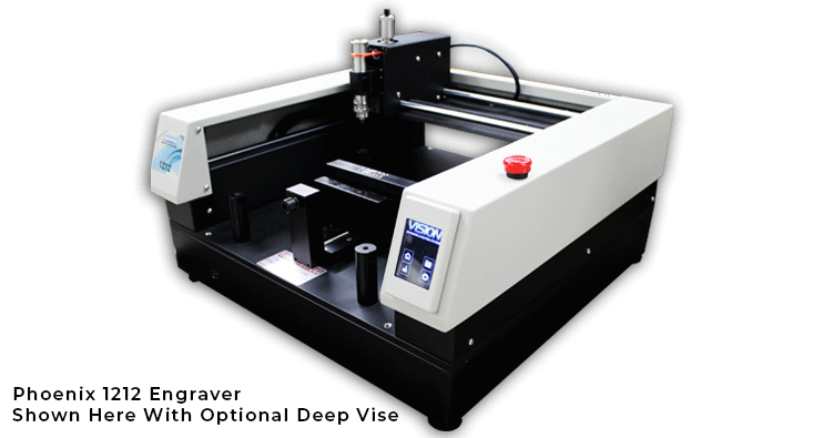 The Phoenix 1212 Engraver is a user-friendly desktop engraving machine  with a highly adaptive work area. It has a medium size form factor with an open back design. This allows the Phoenix to fit on most counter-tops and engrave materials as big as 12” x 12” or longer. It comes with an aluminum T-Slot table for holding down flat materials but can also engrave odd shaped items up to 3 ¼” thick using it’s optional deep vise. V-Touch Technology, its newest upgrade adds a multi-functional touch screen display, internal memory, and other performance enhancing features.
